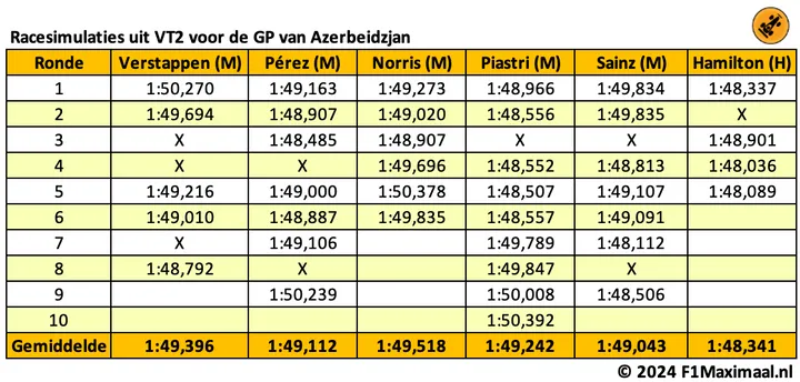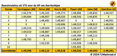 Het tweede deel van de tweede vrije training is doorgaans het belangrijkste deel van de vrijdag van een raceweekend. De coureurs werken eerst een kwalificatiesimulatie af, en daarna is het tijd voor de racesimulaties. Uit de long runs uit Bakoe wordt duidelijk dat Max Verstappen en Lando Norris allebei nog niet op koers liggen voor de overwinning. Een zevende winnaar in acht weekenden tijd is niet ondenkbaar. Max Verstappen,