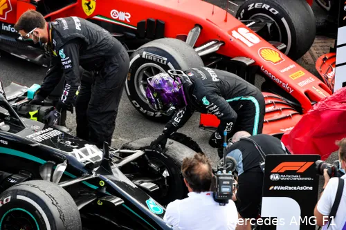 Lewis Hamilton en Roscoe zitten voor de Mercedes W11 in Turkije, waar Hamilton zijn zevende wereldtitel pakte. (Foto: Mercedes AMG F1) Grosjean komt met de schrik vrij