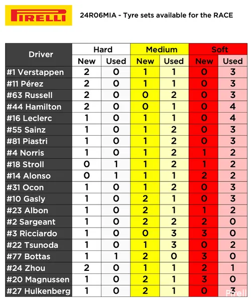 Gezien de aanbevolen strategie om te starten op mediumbanden en vervolgens over te stappen op harde banden, zit het team van Red Bull er goed bij voorafgaand aan de race in Miami. Zoals in het schema hieronder te zien is, beschikken beide Red Bull-coureurs over twee sets nieuwe harde banden en een set nieuwe mediumbanden. De Oostenrijkse renstal beschikt als enige team over drie sets nieuwe banden binnen de aanbevolen strategie.