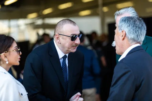 Natuurlijk vinden er ook serieuze gesprekken plaats in de paddock. Formule 1-directeur Chase Carey schudt de hand van de promotors van de Azerbeidzjaanse Grand Prix.