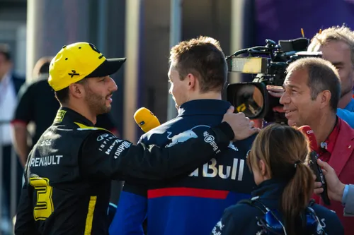 Een prachtig moment na afloop van de race in Baku. Middenin een TV interview biedt Daniel Ricciardo zijn excuses aan bij Daniil Kvyat. De twee heren reden op een knullige manier tegen elkaar aan, toen Ricciardo even vergeten was