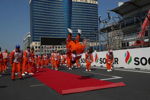 Aan het begin van iedere dag vond er in Baku een verplichte warming-up plaats voor al het Azerbeidzjaanse personeel langs de baan. Daarbij is er natuurlijk altijd één iemand die daar net iets meer zijn best voor doet...