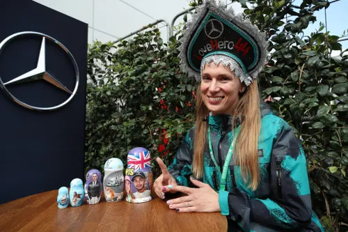 In de categorie 'opvallende fans' zijn we aangekomen bij de hopsitalityruimte van Mercedes. Deze vrouw uit Sochi, Elena Vasileva, trekt veel bekijks met haar bijzondere uitstraling. Speciaal voor het team bracht ze handgemaakte baboesjka poppen mee. Het is geen geheim dat