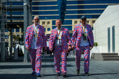 Een opvallende verschijning in de paddock afgelopen zaterdagmiddag. Deze Britse heren bezoeken eenmaal per jaar een Grand Prix en doen dat doorgaans met stijl. Al 22 jaar lang gebeurt dat met hetzelfde pak.