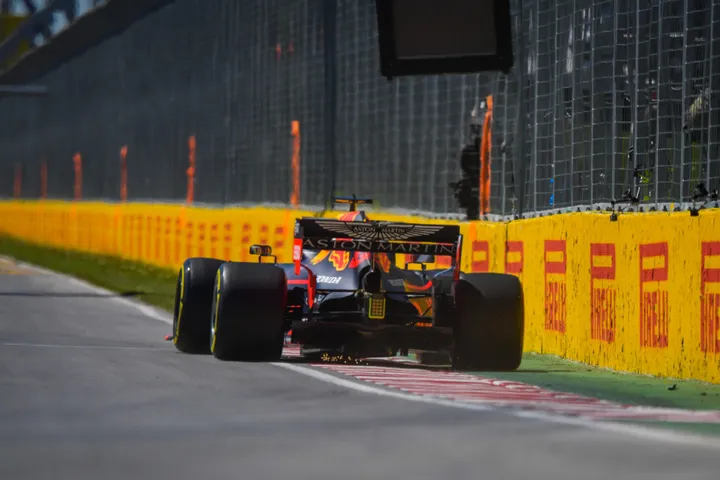 Van dichtbij is goed te zien hoe de coureurs dicht bij de beruchte 'wall of champions' komen. Max Verstappen hield tijdens de race constant slechts enkele centimeters over tussen de onverbiddelijke muur en zijn RB15.