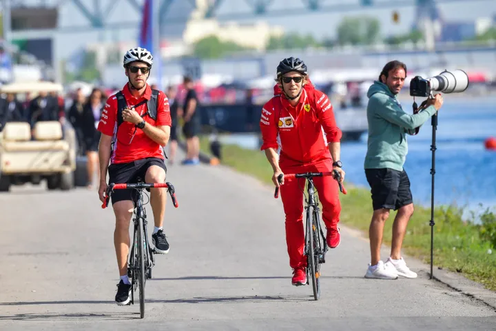 Sebastian Vettel deed een rondje Montreal, maar dit keer iets langzamer. De Ferrari-coureur trok zijn racefiets uit de kast en dat gaat uiteraard, op z'n Duits, met helm. Vettel verkent het circuit op vrijdag samen met zijn fysio en persoonlijk begeleider.