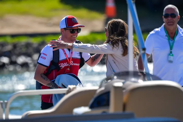 Een zeldzaam plaatje: Een lachende Kimi Raikkonen. De Fin keek in een aangemeerd bootje en zag plots Stefania Bocchi zitten, een werkneemster van Ferrari waar The Iceman jarenlang mee samenwerkte. Uiteraard volgde er een knuffel en Kimi kon een brede lach niet onderdrukken.