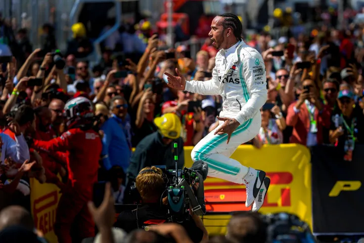 Lewis Hamilton ging letterlijk en figuurlijk vliegend het weekend uit. De Brit pakte de overwinning na een tijdstraf van Vettel en was uitzinnig toen hij de auto uit klom. Er werd fraai vastgelegd hoe Hamilton vliegend zijn teamgenoten tegemoet ging.