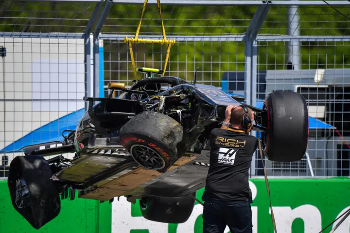 Een pijnlijk aanzien voor alle Haas-fans. De auto van Kevin Magnussen wordt na zijn zware crash in Q2 teruggebracht naar de pitbox van de Amerikanen. Van de bolide is niet heel veel meer intact. Vanuit de pitstraat kon er een mooie foto van worden gemaakt.