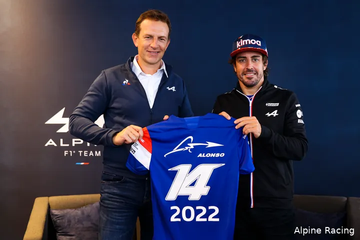 Een trotse Laurent Rossi (links) kondigt Fernando Alonso (rechts) aan als F1-coureur voor 2021. Inmiddels is duidelijk dat hij ook in 2022 uit zal komen voor de Franse renstal. (Foto: Alpine Racing)