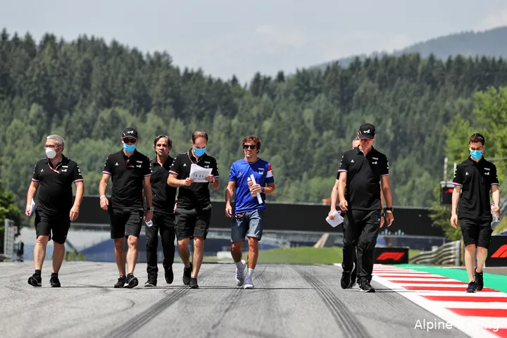 Fernando Alonso tijdens een track walk in Stiermarken. Van Azerbeidzjan tot en met Hongarije bewandelde hij op de donderdag elk evenement het circuit, waarna hij elke race punten scoorde. Dit werd een soort bijgeloof: wilde hij punten scoren? Dan móést hij die track walk doen. (Foto: Alpine Racing)