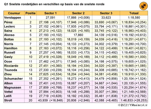 Het is ongelooflijk hoe dicht het hele veld op elkaar zit. De vloeiende baan die geoptimaliseerd is voor sneller rijden en voor betere inhaalmogelijkheden, draagt hier in combinatie met de vernieuwde reglementen absoluut aan bij. In de tabel hierboven staan de snelste ronden van de coureurs met sectortijden en verschillen met deze sectortijden en de volledige ronde. In lichtrood zijn de afvallers van Q1 aangegeven. De tijd van Stroll is feitelijk alleen een opwarmrondje, omdat hij nog niet begonnen was aan een snelle ronde toen hij Latifi van de baan duwde. Om te zien of het allemaal nog een tandje beter had kunnen zijn, hebben we voor het gemak de snelste sectortijden van alle coureurs ook bij elkaar gezet. Het blijkt dat dat de eindstand echter niet beïnvloed zou hebben. Alleen zou dan in plaats van de top tien de top elf binnen een seconde van elkaar geëindigd zijn.