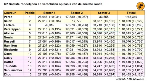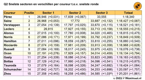 Valtteri Bottas lukt het echter niet om door te stomen, en het is voor het eerst sinds Abu Dhabi in 2016 dat hij niet door is naar Q3 in de kwalificatie. Opvallend is, zie de tabel voor Q2, dat de hele top elf ruimschoots binnen negen tienden van een seconde van elkaar staat. Het is ongelooflijk, en dit is waar we uiteindelijk op gehoopt hadden voor dit jaar. Je blijft op het puntje van je stoel zitten doordat het enorm spannend is nu de auto's allemaal zo dicht bij elkaar staan qua prestaties. Ook hier hebben we weer de snelste sectoren uitgezocht en bij elkaar gezet, en dit zou de rangorde aardig door elkaar geschud hebben, al is dat niet het geval voor de afvallers. Verstappen had een plaatsje hoger kunnen eindigen, en
