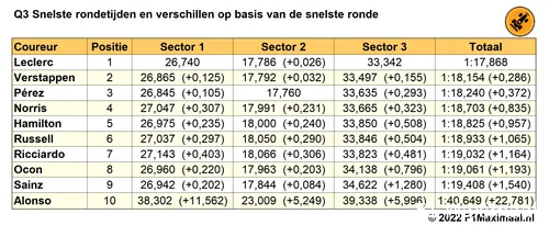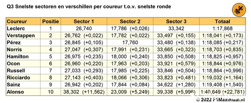 De eindstand is weergegeven in de tabel voor de snelste ronden in Q3, en dit keer zijn de verschillen duidelijk wat groter. De top vijf zit net binnen een seconde, en daar houdt het dit keer op, een teken dat de top drie nog wat uit de kan heeft weten te halen. De top drie heeft nu een voorsprong gecreëerd van maar liefst een halve seconde op de rest, waar dat voorheen allemaal veel dichter bij elkaar zat. We hebben wederom alle snelste sectortijden per coureur samengevoegd. Dit zou de top vijf niet veranderd hebben, zij het dat de top drie nog iets dichter bij elkaar zou liggen als zij een perfect rondje gedraaid zouden hebben. Verderop op de grid zou