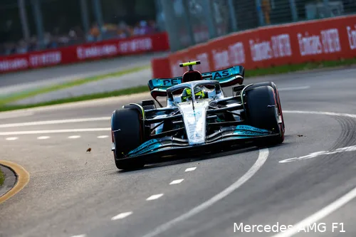 Hamilton in zijn W13 op het Albert Park Street Circuit tijdens de kwalificatie voor de Grand Prix van Australië (Foto: Mercedes AMG F1) Alonso heeft een engine shutdown, al roept hij zelf over de boordradio dat het een hydraulisch probleem is – hij kan niet meer schakelen. Natuurlijk