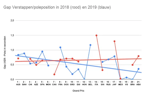 Red Bull Racing. Wij analyseerden de 'gap' in de kwalificatie tussen Verstappen en poleposition van de afgelopen twee seizoenen, waarbij een algemene trendlijn werd berekend.