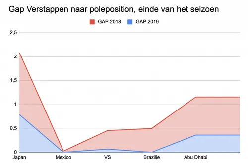 De stormachtige ontwikkeling van Red Bull ten opzichte van het 2018-seizoen kan ook statistisch onderbouwd worden. De rode trendlijn laat duidelijk zien dat het gat naar poleposition gedurende het hele vorige jaar blijft steken op gemiddeld zes tienden. In 2019 gaat het gat, in verhouding tot de topteams, van 0,80 naar zo'n 0,25 seconden. Dat is in een seizoen een inhaalslag van een kleine zes tienden; een reuzensprong ten opzichte van 2018.