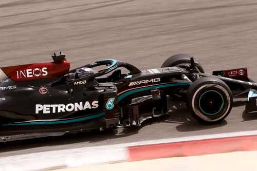 De Mercedes W12 was in de wintertests niet vooruit te branden, maar Lewis Hamilton pakte twee weken later met deze bolide wel de overwinning in Bahrein. (Foto: Mercedes AMG F1) Mercedes en Aston Martin spelen verstoppertje, Red Bull speelt relatief open kaart