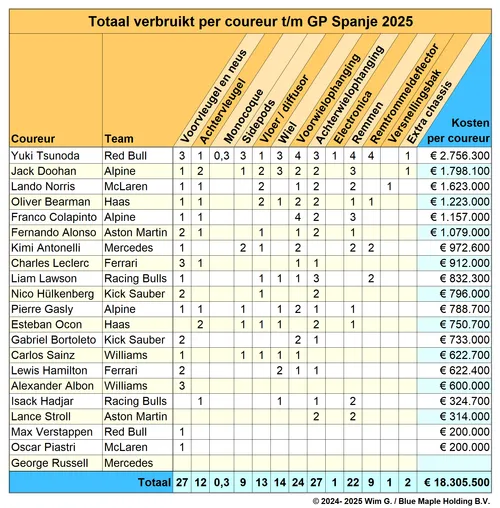 Crashes horen bij de Formule 1, maar afgelopen weekend in Spanje hielden haast alle coureurs het hoofd koel. Alleen bij Max Verstappen leek het lampje even uit te gaan aan het einde van de race. Wonder boven wonder ontsnapt Red Bull Racing aan een schaderekening tijdens dit raceweekend, want de viervoudig wereldkampioen liep geen schade op aan zijn bolide. Echter waren er wel twee andere coureurs die kosten maakten. Wie heeft tot dusver de meeste schade gereden in 2025? Het wordt voor je bijgehouden in 'Brokkenpiloten'. Afgelopen weekend was het weer tijd voor de Grand Prix van Spanje, en dat is voor veel coureurs bekend terrein. In het verleden was deze baan namelijk ook de thuishaven voor de wintertests, dus menig rijder heeft hier al flink wat ronden gereden. Dit was dan ook terug te zien in de gereden schades op het Circuit de Barcelona-Catalunya, want er waren slechts twee rijders die wat aan hun bolide moesten laten vervangen.