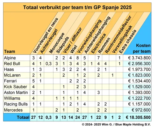 Op de baan waren dit de enige schades die we te zien kregen, maar achter de schermen gebeurde er ook nog het een en ander. Bij Alpine werd er namelijk nog flink gesleuteld aan de bolide van Franco Colapinto. In Parc Fermé werden namelijk alle ophangingen van de auto van de Argentijn vervangen, en daardoor is de schaderekening voor het team van Alpine opgelopen tot €426.000, en daarmee houdt het team de koppositie in het Brokkenpiloten-klassement stevig in handen.