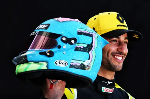 Daniel Ricciardo heeft zijn helm voor aankomend raceseizoen gepresenteerd aan de buitenwereld. De helm, uitgegeven door het merk Arai, is voornamelijk blauw en roze en draagt een grote nummer drie – zijn startnummer – aan de zijkant. In de winter riep de Australier, die dit seizoen de overstap heeft gemaakt van Red Bull Racing naar Renault F1, zijn fans op om zijn nieuwe helm te ontwerpen. Daar is zijn huidige helm het eindresultaat van. Gedurende de wintertests droeg Ricciardo nog een witte testhelm.