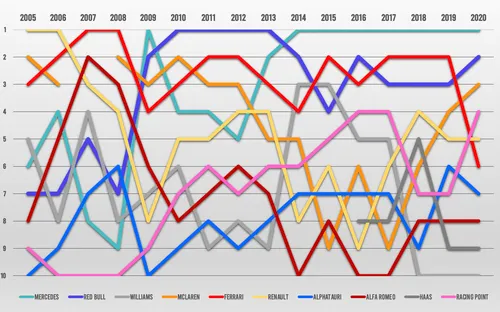 McLaren zat de renstal in één van de meest spraakmakende Formule 1-schandalen aller tijden. Het is ook gelijk opvallend in bovenstaande grafiek: er mist een streep bij McLaren. Het Spygate-schandaal was de oorzaak: in dit jaar zou de Britse renstal gespioneerd hebben bij titelconcurrent