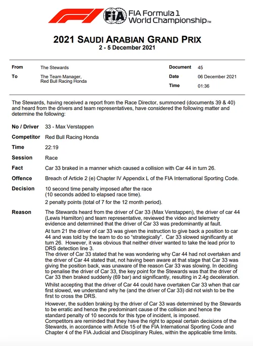 RB16B. 'Ondanks dat Hamilton ruimte had om Verstappen in te halen, begrijpen wij waarom hij dat op dat punt niet wilde doen. Omdat het afremmen van Verstappens auto dergelijk fors was, zien wij dat als de voornaamste oorzaak van het incident', zo luidt het oordeel.