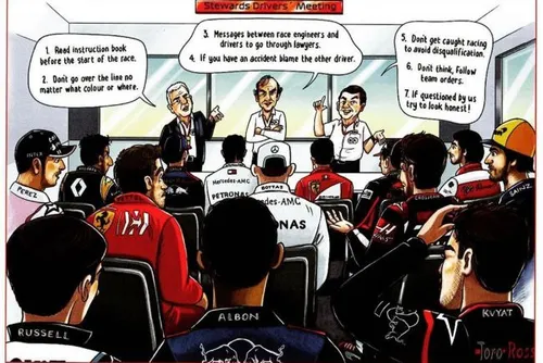 Traditiegetrouw stuurt de oude baas van de Formule 1 Bernie Ecclestone een F1-geïnspireerde kerstkaart de deur uit. Doorgaans hebben de kaarten een kritische noot; dit jaar pakt Ecclestone de stewards aan. In deze terugblik op het 2019-seizoen is een drivers meeting afgebeeld, tussen de stewards, wedstrijdleiding en coureurs. De ex-baas is niet geschuwd van controverse, zoals blijkt uit de spotprent over dit seizoen: ‘Lees het instructieboek voor de race goed door', 'zorg dat je binnen alle lijnen blijft', 'geef de andere coureur de schuld van je crashes', 'pas op met racen, want anders word je gediskwalificeerd' en 'denk niet na, volg gewoon teamorders.’ (Foto: F1)