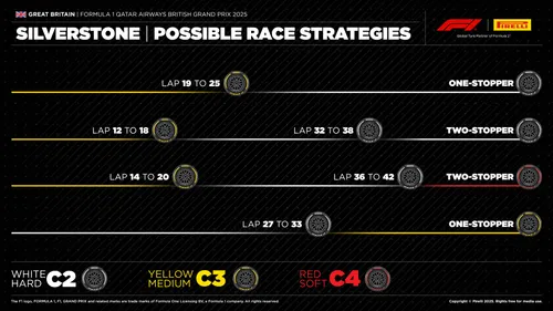 softs over, omdat hij niet doorging naar Q3. Zonder regen geeft Pirelli aan dat er vier mogelijke strategieën zijn: een éénstopper medium-hard, een éénstopper hard-medium, een tweestopper medium-hard-hard, of een tweestopper met alle compounds, dus medium-hard-soft.