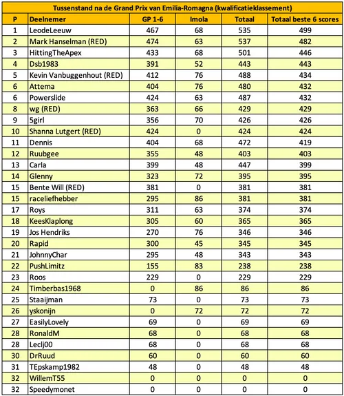 Tussenstand in het Kwalificatieklassement na de Grand Prix van Emilia-Romagna: