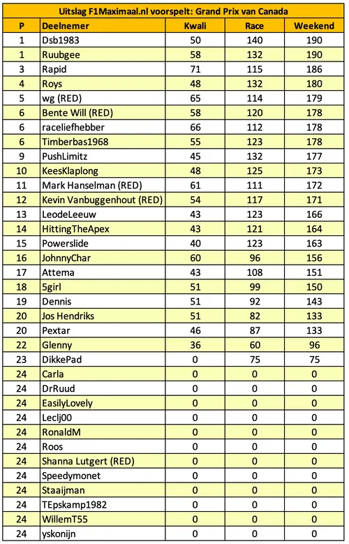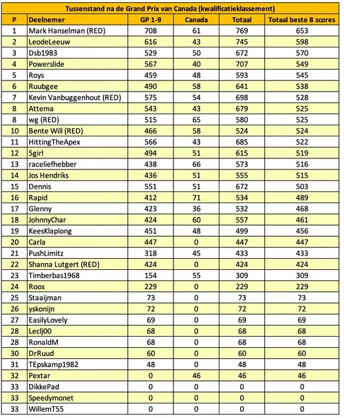 Tussenstand in het Weekendklassement na de Grand Prix van Canada:
