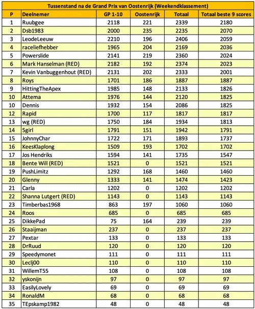 Tussenstand in het Weekendklassement na de Grand Prix van Oostenrijk: