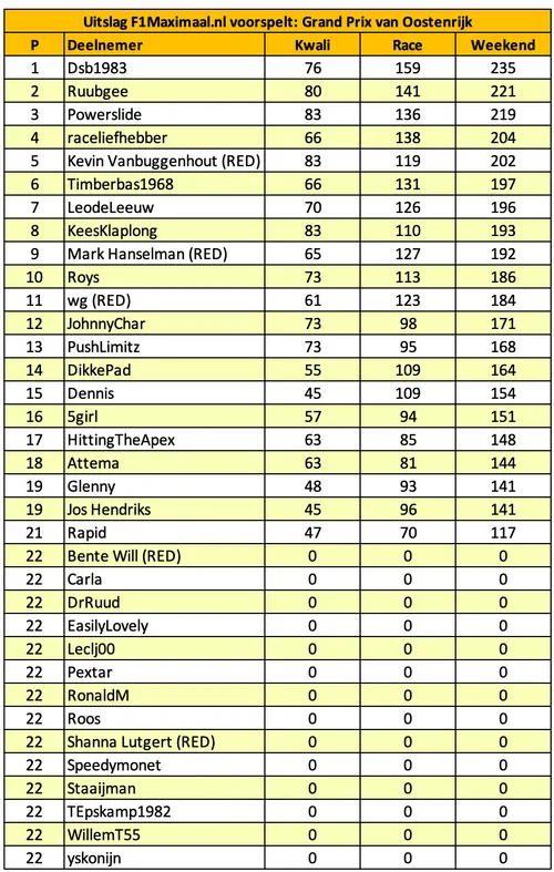 De zondag in Canada zorgde voor de nodige verrassingen. Uitvalbeurten van Max Verstappen, Kimi Antonelli en beide Williams-coureurs boden veel kansen aan de vijf kleinere teams, maar hierdoor vielen veel weekendscores wel lager uit. Dsb1983 pakte met 235 punten de meeste punten na het weekend in Oostenrijk. Hij deed dit vooral via de goede voorspelling van de race, door Liam Lawson, Gabriel Bortoleto, én Fernando Alonso in de punten te zetten. Drie deelnemers deelden de beste score op zaterdag met 83 punten.