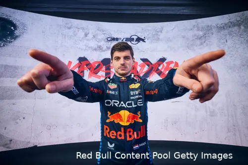 Bij deze studiofoto van Max Verstappen is niet de RB20 gebruikt op de achtergrond. Deze foto's zijn gebruikt voor de presentatie van de nieuwe racepakken.