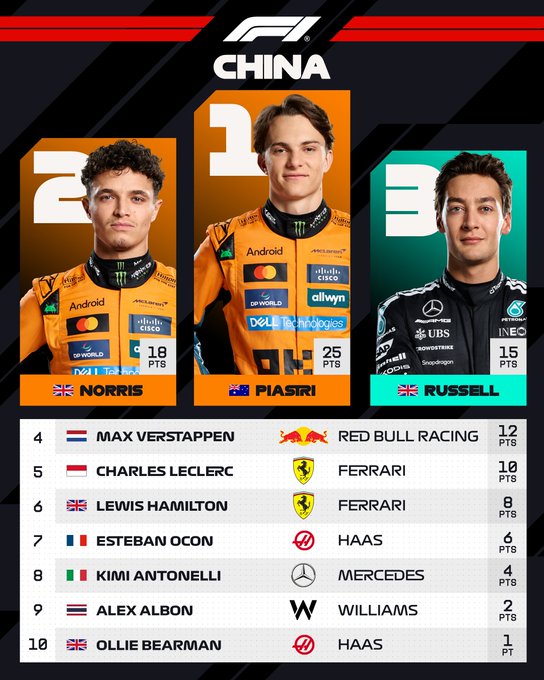 McLaren heeft een dubbelzege gepakt in China. De constructeurskampioen controleerde de race en liep uit op de rivalen. Max Verstappen had een slechte start en een dramatische eerste stint, maar herstelde zich daarna knap in de lange tweede stint. Verstappen haalde Leclerc in de slotfase van de race in, en eindigde zo knap als vierde, achter George Russell. Zoals verwacht begon bijna iedereen met de mediumbanden aan de Grand Prix. Alleen