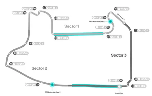 De eerste bocht is complex, en dient goed genomen te worden om ook in bocht 2 de maximale snelheid te bereiken. De eerste bochtencombinatie mondt uit in een DRS-zone, waarna wederom enkele trage bochten volgen, waarvan de meeste in de tweede versnelling genomen worden. Met deze eerste sector hebben de heren meteen het high-downforce-gedeelte van het circuit gehad, en gaan ze door naar de sectoren waarin weinig luchtweerstand beloond wordt.