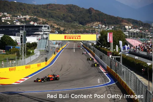 Het rechte stuk naar bocht 1 op Sochi Autodrom is heel erg lang. Een start vanaf P4 hoeft dus niet nadelig te zijn, terwijl er gedurende de race in deze bocht ook voldoende inhaalmanoeuvres te zien zullen zijn. (Foto: Red Bull Content Pool/Getty Images)