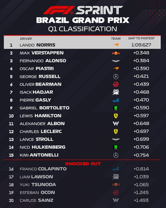 Uitslag sprintkwalificatie GP van São Paulo 2025