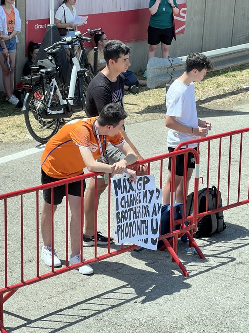 Max Verstappen fans. Een fan maakt het echter wel heel erg bont. Hij heeft namelijk een bordje waarop staat: 'Max, ik wil mijn broer ruilen voor een foto met jou.'