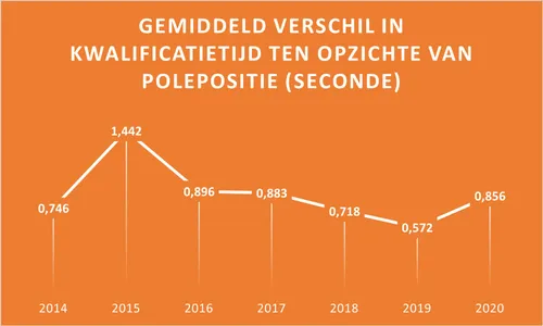 Verschil in kwalificatietijd ten opzichte van polepositie, in chronologische volgorde.