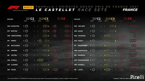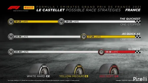 De strategische opties zullen beperkt zijn tijdens de Grand Prix van Frankrijk. Een één-stopper lijkt de meest effectieve optie te zijn voor alle coureurs. Echter, regenbuien kunnen hier verandering in gaan brengen. De verwachting is dat de meeste coureurs van de medium-band over zullen stappen naar de harde band.