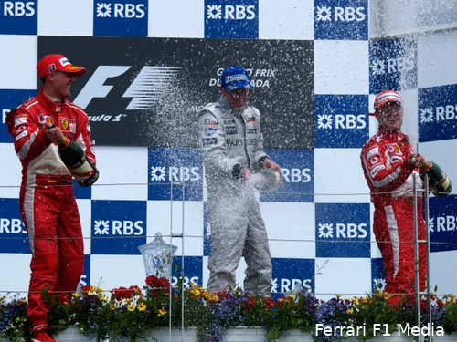 Kimi Räikkönen won de Grand Prix van Canada in 2005 voor de Ferrari's van Michael Schumacher en Rubens Barrichello. Het was de laatste keer dat deze drie heren een podiumceremonie deelden (Foto: Ferrari F1 Media). We duiken iets dieper de geschiedenisboeken in voor het podiumtrio bestaande uit