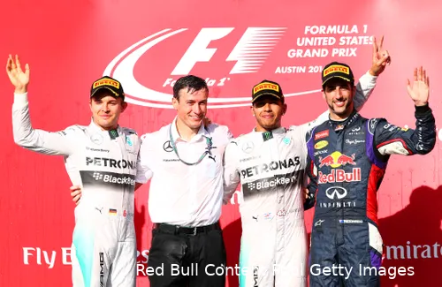 Lewis Hamilton, Nico Rosberg en Daniel Ricciardo deelden het podium veelvuldig tijdens de eerste paar jaar van het hybridetijdperk. Hier staan de drie coureurs op het podium na de Grand Prix van de Verenigde Staten in 2014 (Foto: Red Bull Content Pool/Getty Images). Zeven podiums, vijf verschillende trio's
