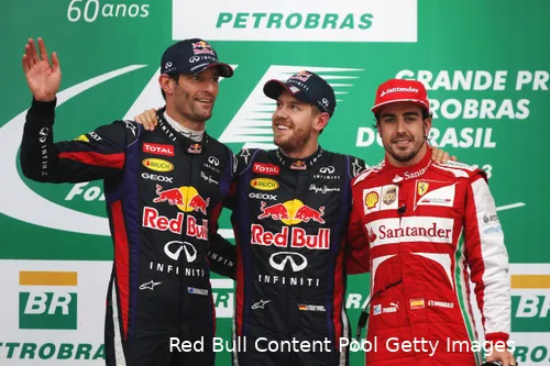 Sebastian Vettel, Mark Webber en Fernando Alonso deelden het podium maar liefst dertien keer. De laatste kwam in Brazilië in 2013 (Foto: Red Bull Content Pool/Getty Images). Twaalf en acht podiums, vier trio's