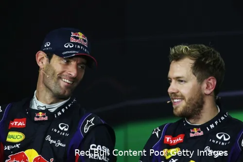 Mark Webber en Sebastian Vettel in Red Bull-kledij tijdens een persconferentie. Ondanks dat Vettel vier titels wist te veroveren voor de Oostenrijkse renstal, haalde hij de populariteit van Schumacher niet. (Foto: Red Bull Content Pool/Getty Images) "De Duitse fans zijn blij dat Seb voor Aston Martin rijdt."