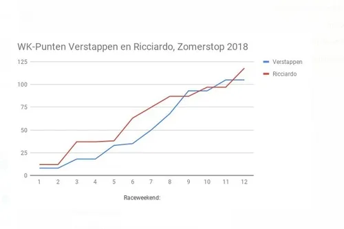 om WK-punten. Door twee overwinningen dit jaar scoorde de Australiër al op 118 punten, tegenover 105 van Verstappen. Echter, Verstappen is wel op weg om hem in te halen. Sinds de Grand Prix van Canada scoort de Nederlander structureel beter, op de laatste race in Hongarije na, waar Verstappen uit viel door een technisch probleem.