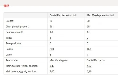 Verstappen bleef echter doorontwikkelen en dat blijkt uit de cijfers uit 2017. Waar in 2016 een duidelijke favorietenrol voor Ricciardo leek weggelegd, zijn de resultaten uit het tweede jaar een stuk meer aan elkaar gewaagd. In twintig raceweekenden was Verstappen namelijk dertien keer sneller in de kwalificaties en bovendien eindigde hij elf keer boven zijn Australische teamgenoot tijdens de races.Daarnaast wist Max maar liefst twee overwinningen te pakken, waarbij Ricciardo bleef steken op één.