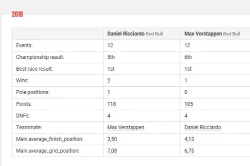 Wel schreven beiden coureurs evenveel overwinningen op hun naam, maar wist Ricciardo vijf maal tweede te worden, terwijl Verstappen dat maar twee keer flikte. Uiteindelijk kwam Ricciardo tot een totaal van 254 WK-punten en Verstappen op 204 WK-punten.