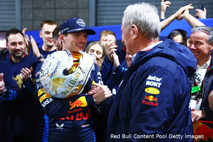 In 2022 en 2023 vierde Max Verstappen zijn wereldtitels ook al door in de rest van het seizoen met een speciale gouden helm te rijden, en dat is in 2024 niet anders. De Nederlander mag zijn vierde sterretje op zijn nieuwe helm nog twee weekenden lang aan de wereld tonen. Helmut Marko is buiten zinnen van vreugde, en durft Verstappens titel zelfs boven het eerste titeljaar van Verstappen te plaatsen. Marko was duidelijk emotioneel nadat zijn coureur ondanks een zeer lastig seizoen toch weer aan het langste eind trok in het gevecht met de coureurs van Ferrari en McLaren, met Lando Norris als laatste uitdager. De Oostenrijker staat net zijn verhaal te doen voor de media als de wereldkampioen langsloopt. 'Hallo!' roept Marko nog, maar Verstappen hoort hem niet en loopt richting het vierkantje voor de interviews.