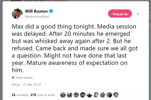 Max Verstappen kon na de zesde testdag in Barcelona rekenen op veel lof en complimenten van Formule 1-journalisten. De Nederlander kwam door vertraging te laat aan bij het officiële persmoment naast het Red Bull motorhome, maar bleef langer om alle pers te woord te staan. Nadat de coureur uit zijn auto klom duurde het even voordat hij de pers had bereikt en dus had Verstappen officieel maar 2 minuten over om zijn verhaal te doen over de woensdag. Dat vertelt onder meer Formule 1-journalist Will Buxton op Twitter.